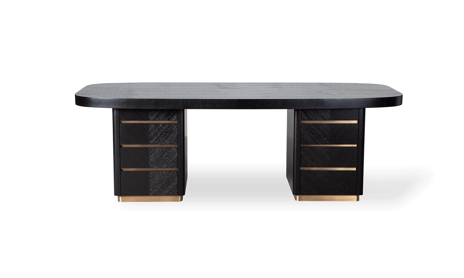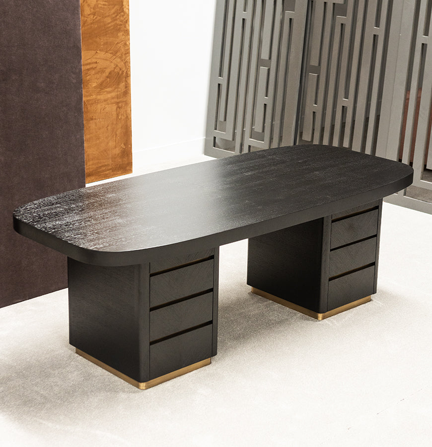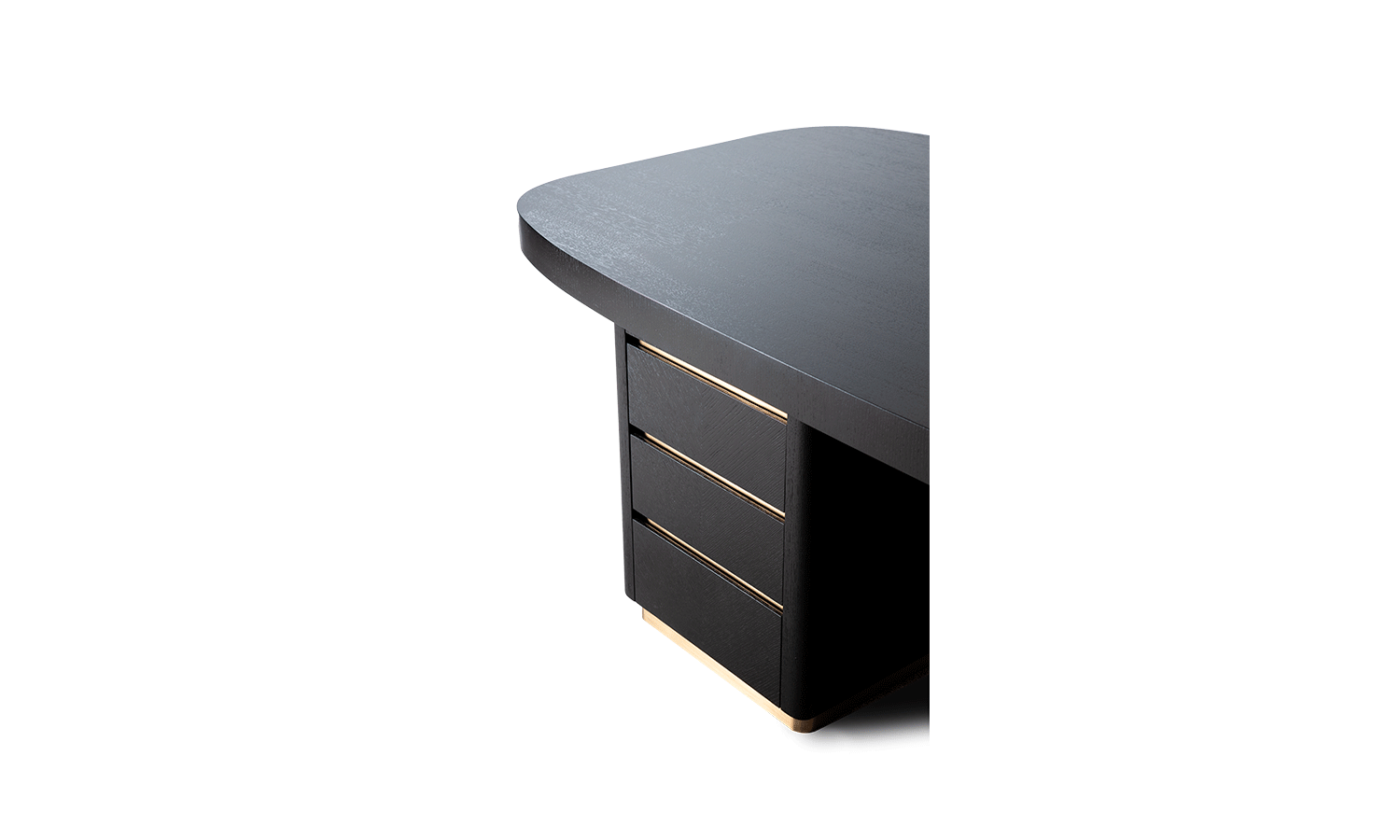 This veneered desk is available in oak with standard finishes. Its brushed brass base and accents make it even more elegante. Other finishes and sizes are available on request.