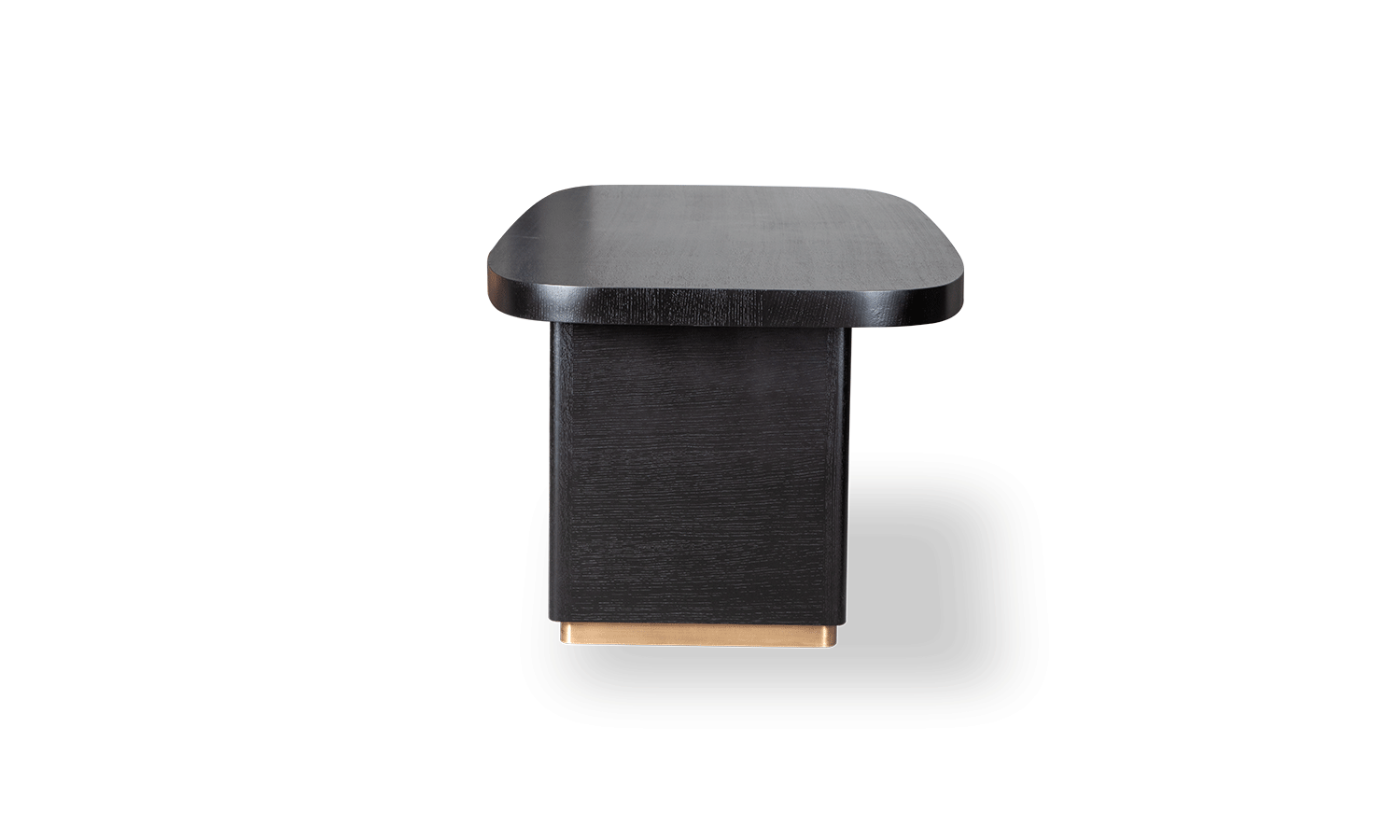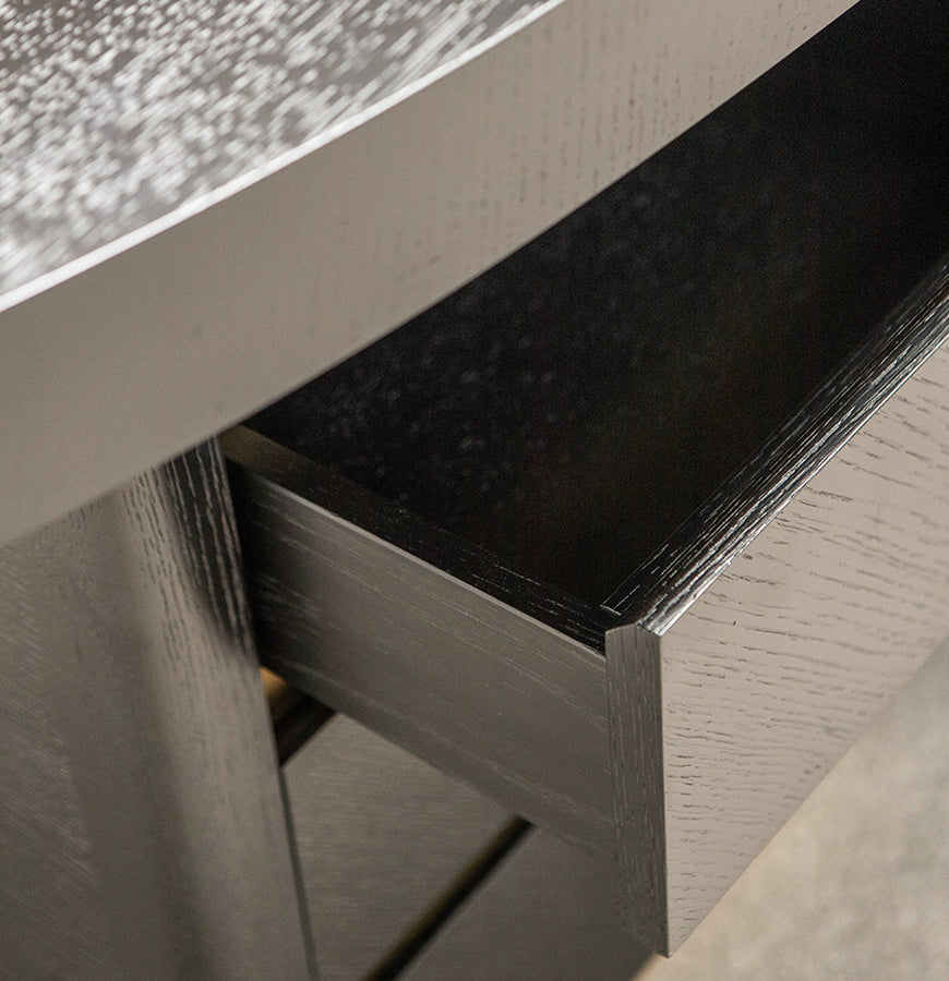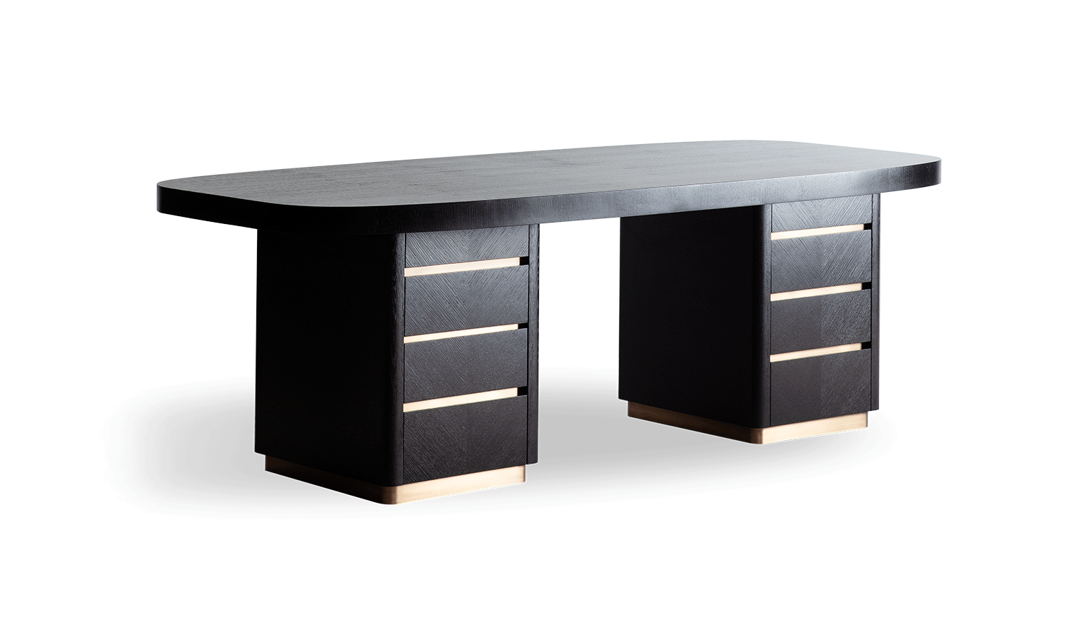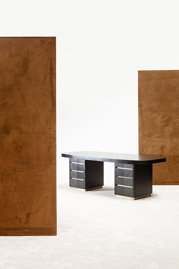 This veneered desk is available in oak with standard finishes. Its brushed brass base and accents make it even more elegante. Other finishes and sizes are available on request.