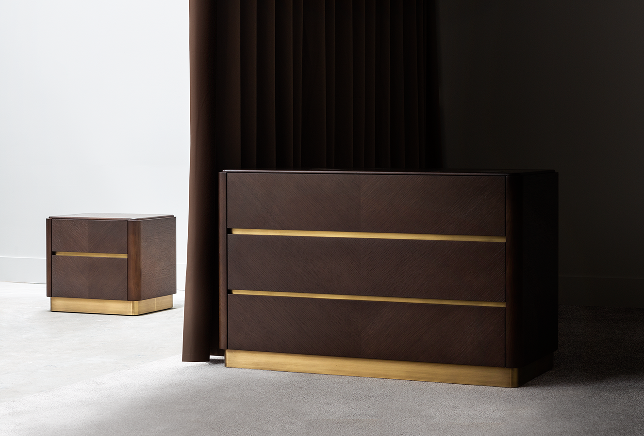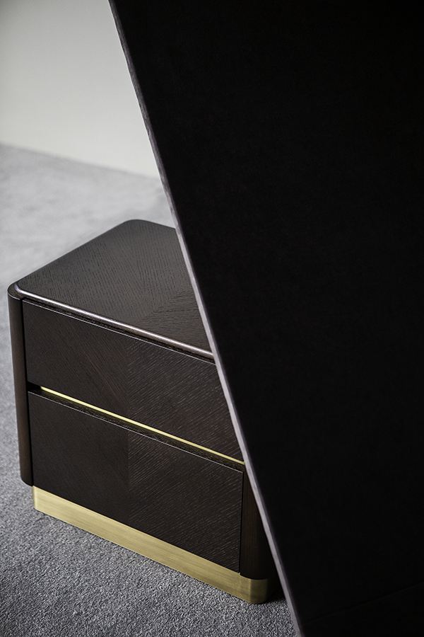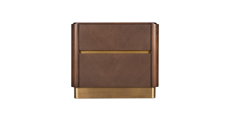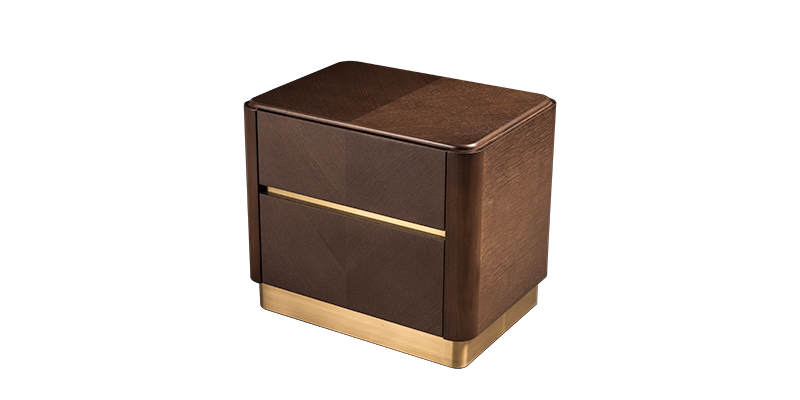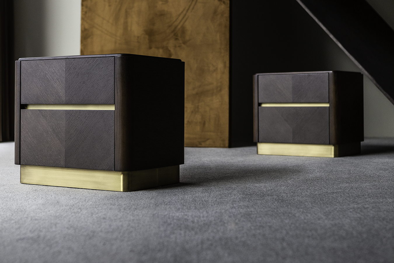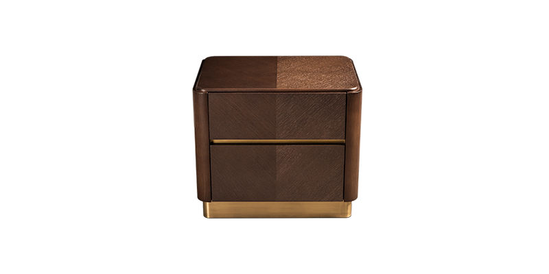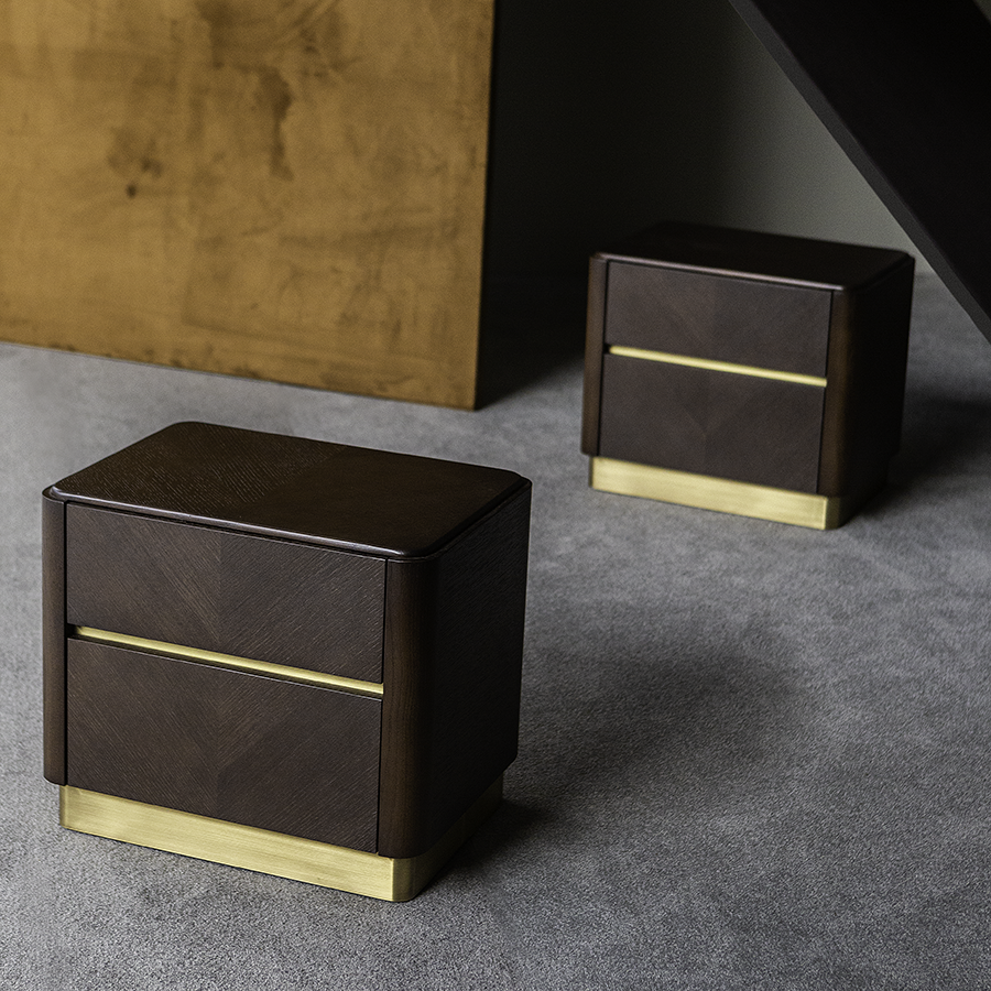 This veneered night table is available in walnut with Cognac finish or oak with standard finishes. Its brushed brass base and accents make it even more elegant. Other choices for the surface plate are available such as marble. Other finishes and sizes are available on request.