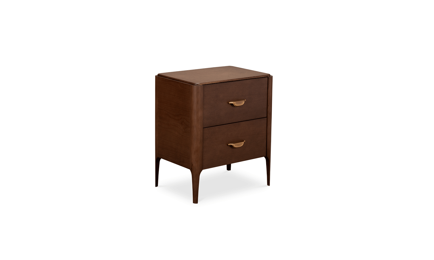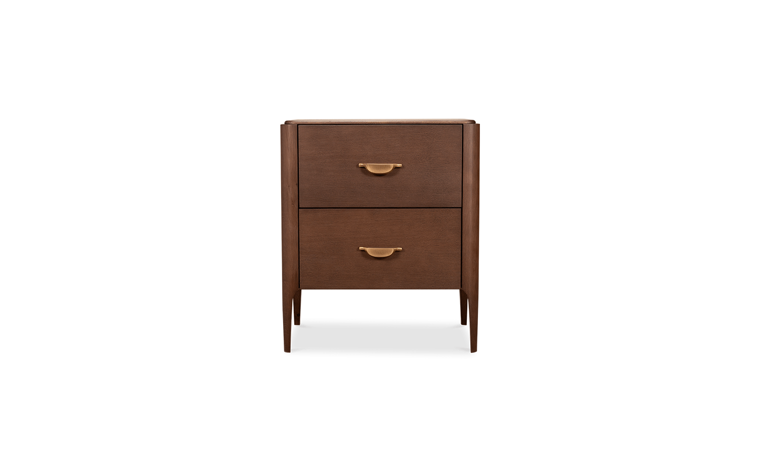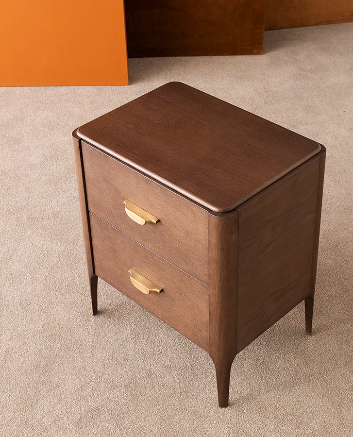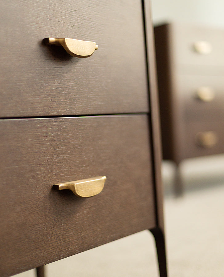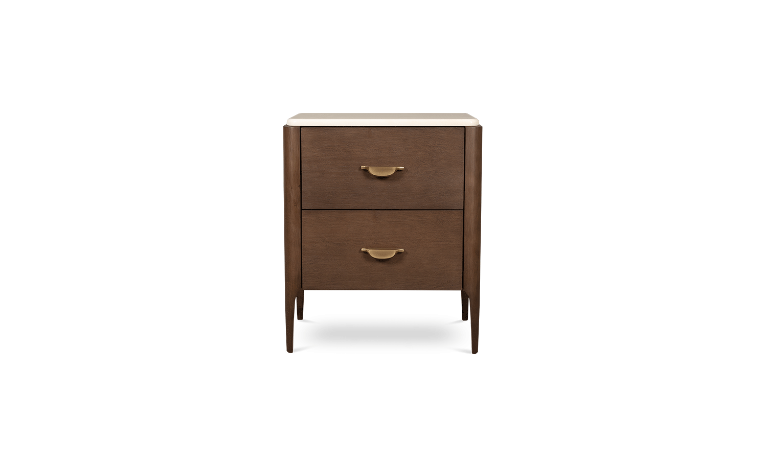 This veneered night table is available in oak with with standard finishes. Its brushed brass base and accents make it even more elegant. Other choices for the surface plate are available such as marble or shagreen. Other finishes and sizes are available on request.