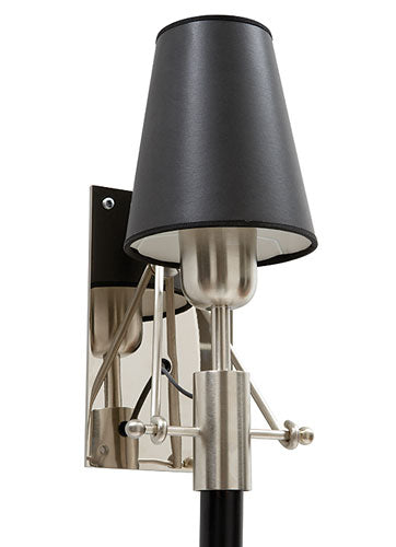polished and satin nickel pinup torche with natural or black wood cue detail and black card shade.