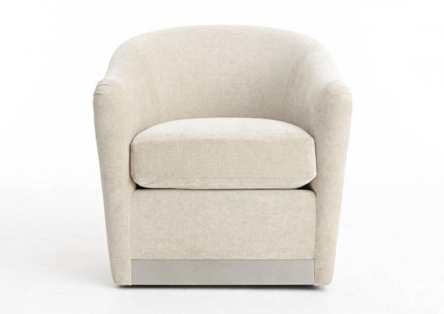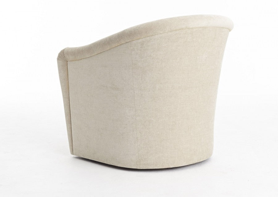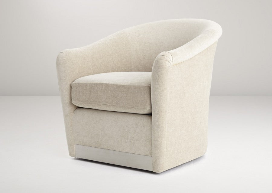 Single loose seat cushion, boxed and double topstitched, 50/50 down and feather fill. Tight continuous-rolled crescent back with pleated arm. Upholstered from deck to plinth base. Swivel base standard.