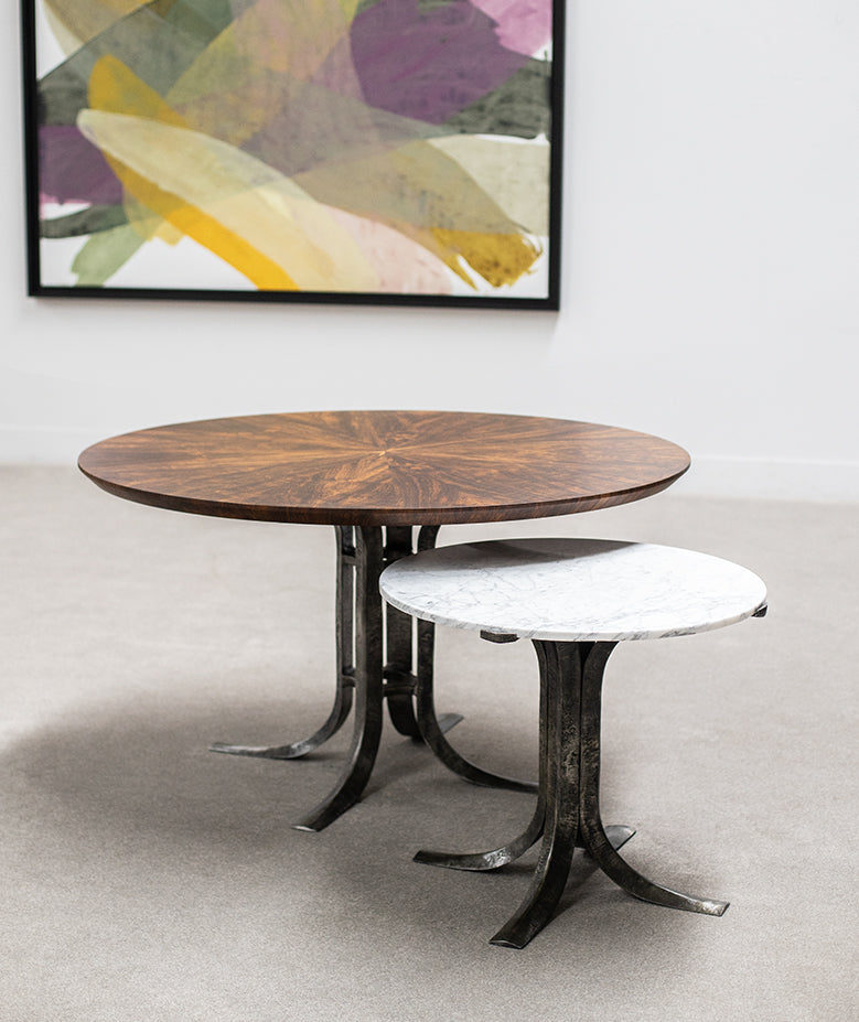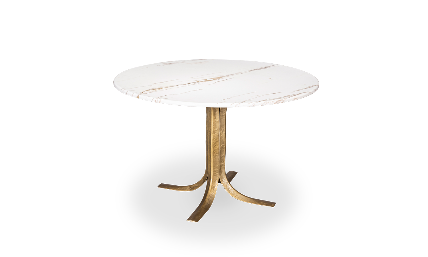 A round top rest on four stem-like bases of refined, graceful geometry, encircles a tray to end up resting on the ground on four solid sepals.