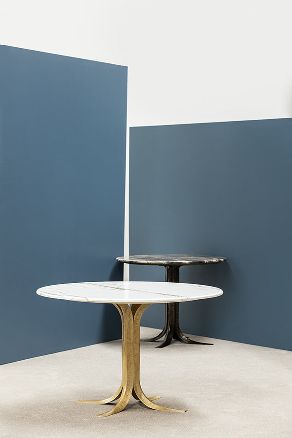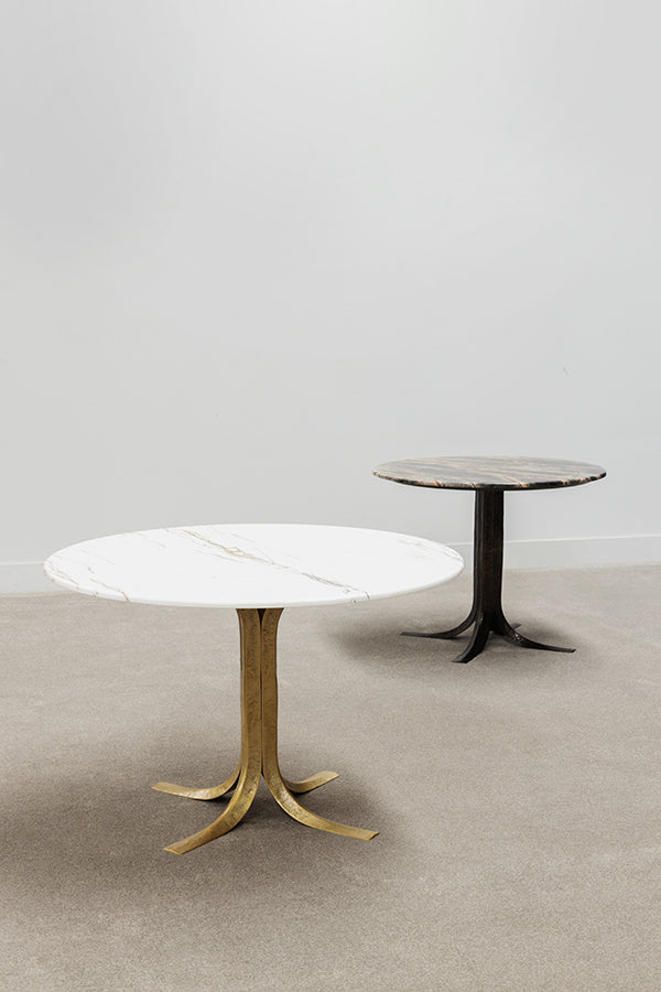 The Talos range is completed by an oval dining table, a coffee table, and a side table. The surface is available in wood or natural stone. The base is available in cast aluminium but can also be made in cast brass.