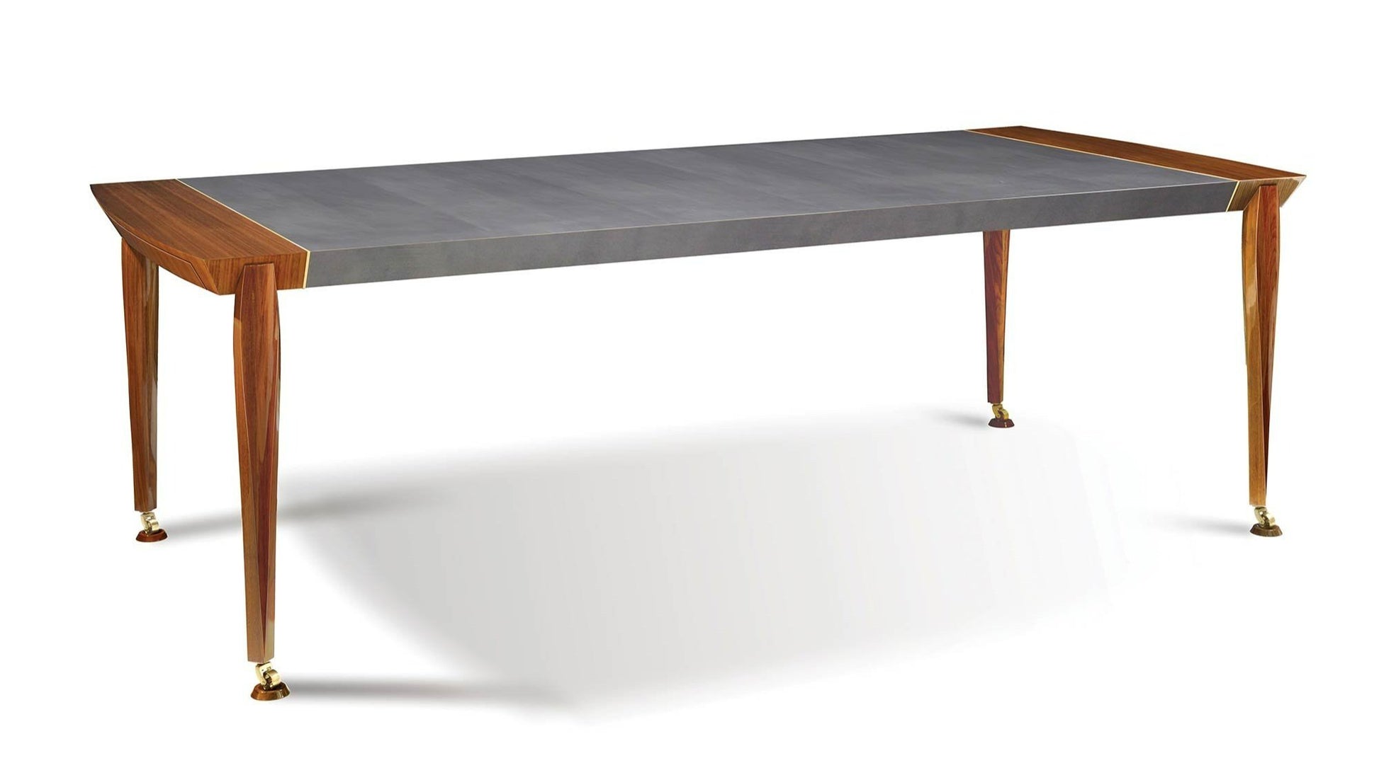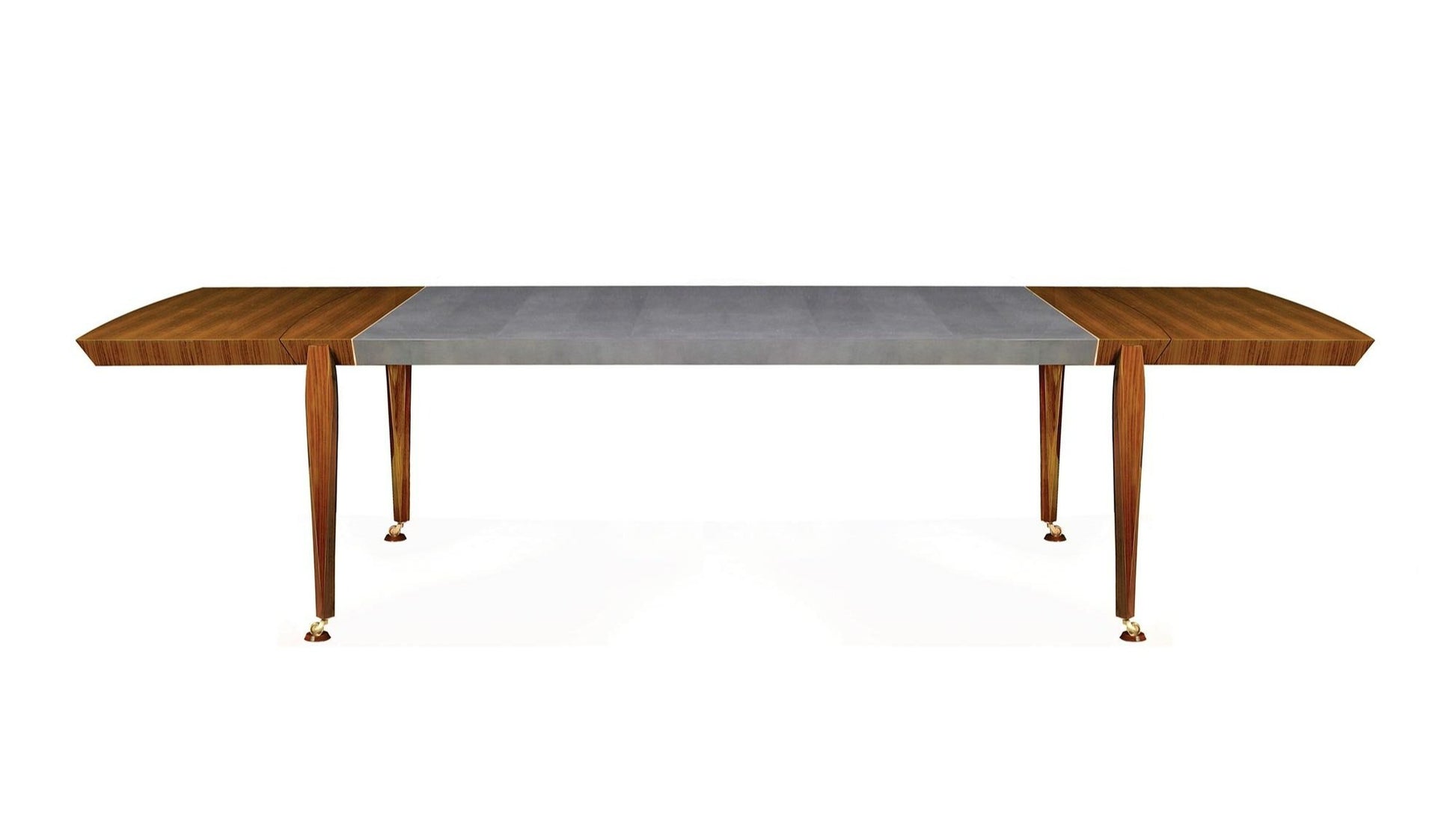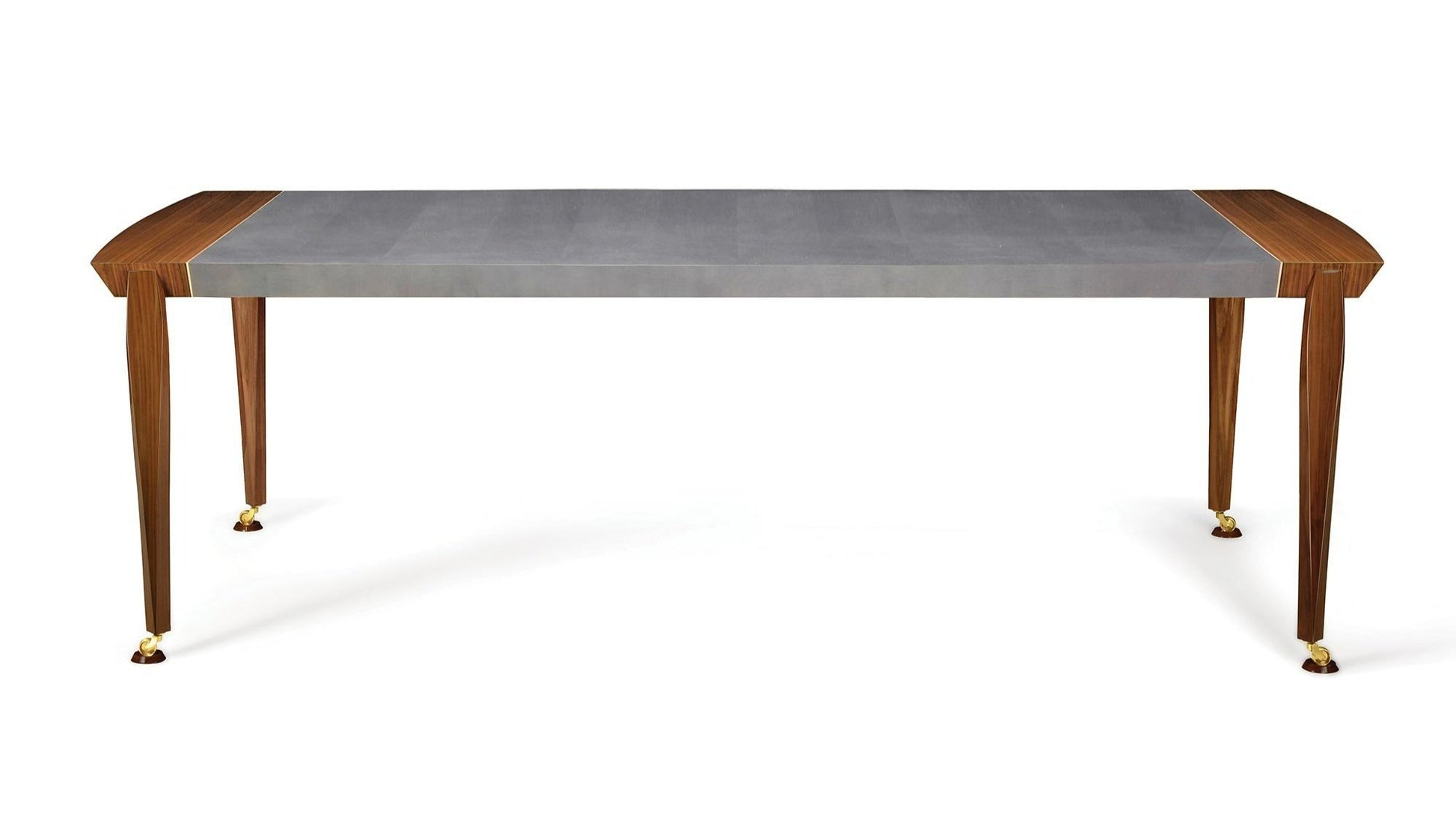 The Tango Table, like its namesake, requires precise execution. The carved, hardwood legs possess a particular animated quality. There is much for the eye to take in: the sculptural attenuated legs, the linear metal insets, contrasting wood veneers in alternating high glass and satin surfaces, while poised on delicate casters.