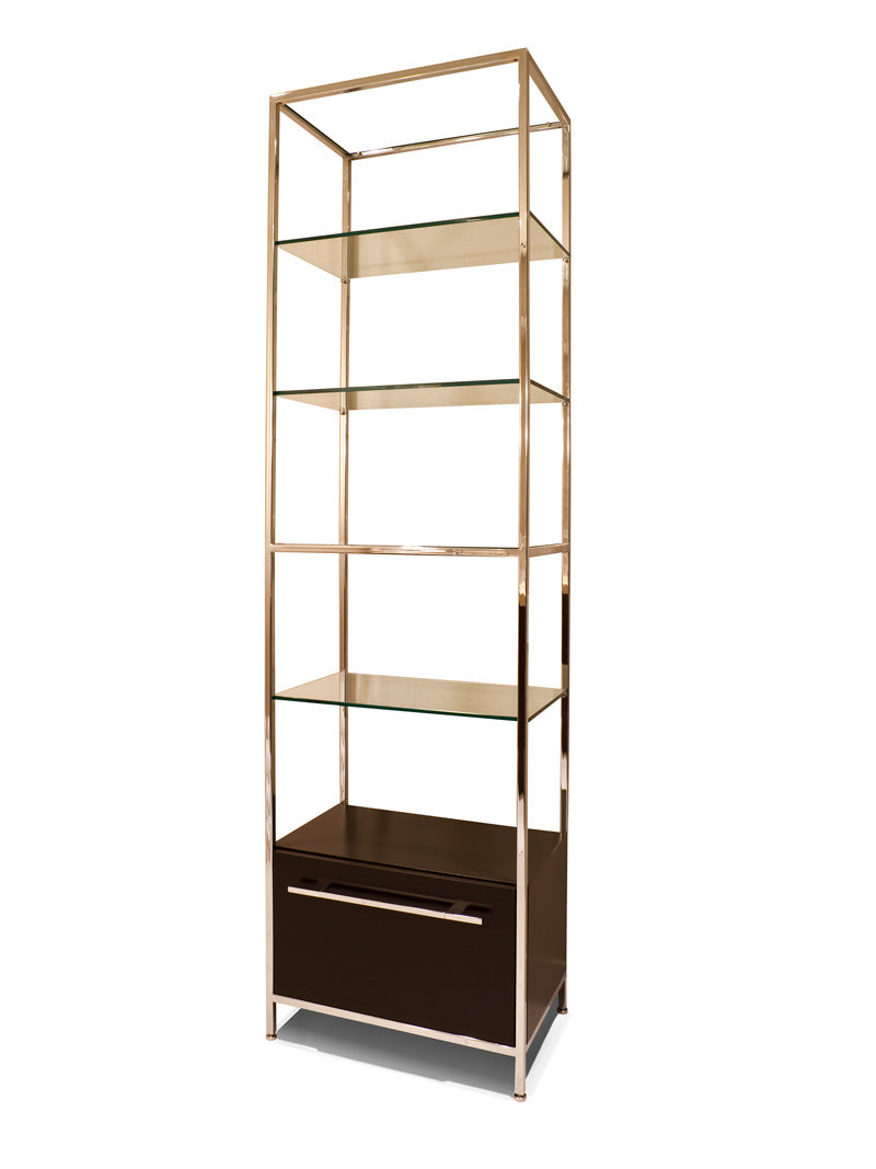 plated steel etagère with tempered starfire glass shelving and wood drawer box. lacquer drawer interior. finish of metal pulls match frame.