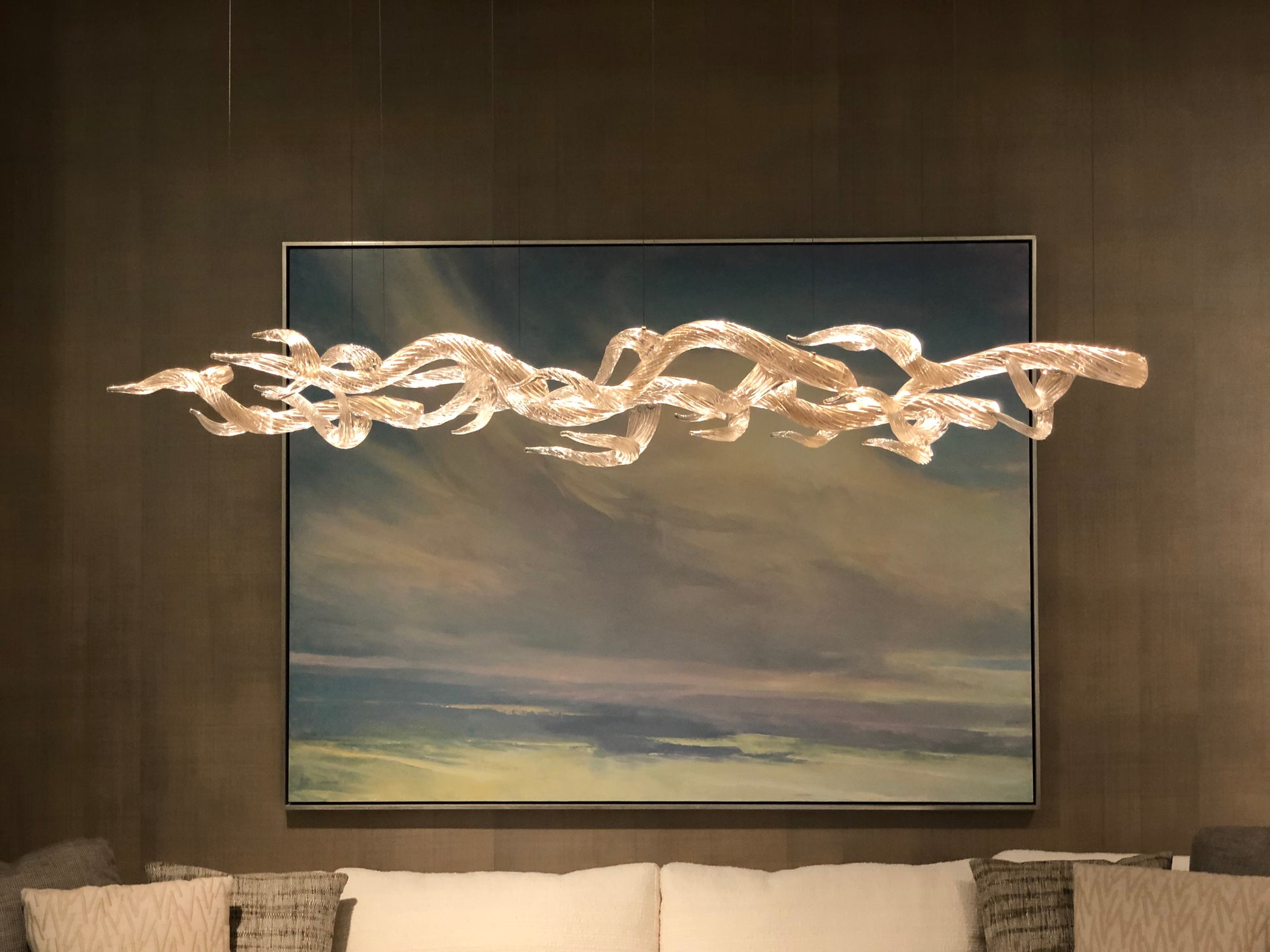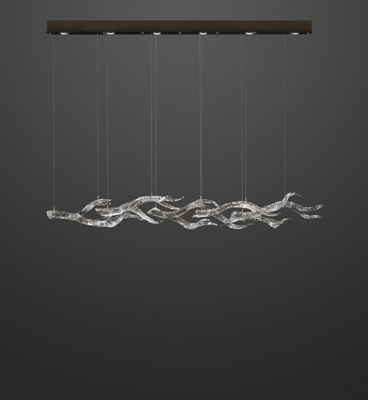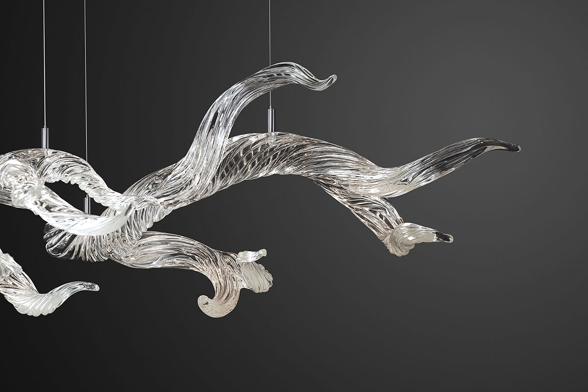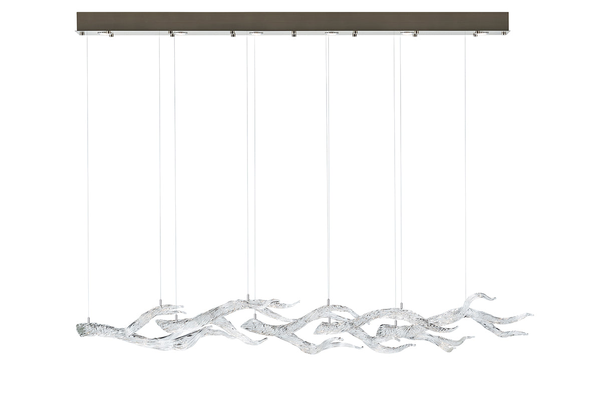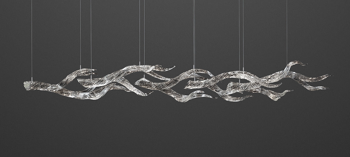 An organic, yet elegant arrangement of hot sculpted, highly textured glass branches. Simple yet complex, each one is a one of a kind illuminated sculpture. Inspired by the beauty of the Sonoma Coast.