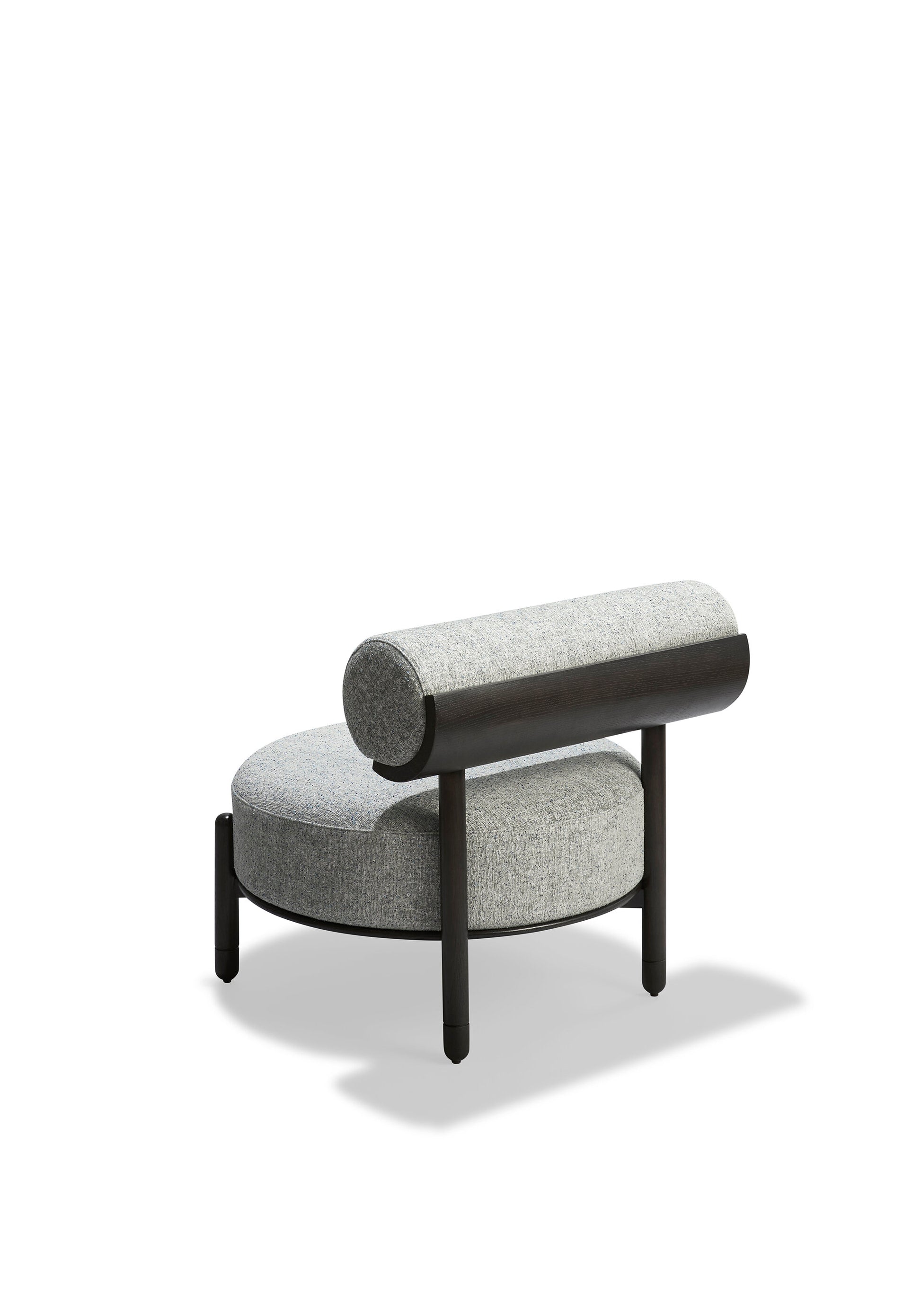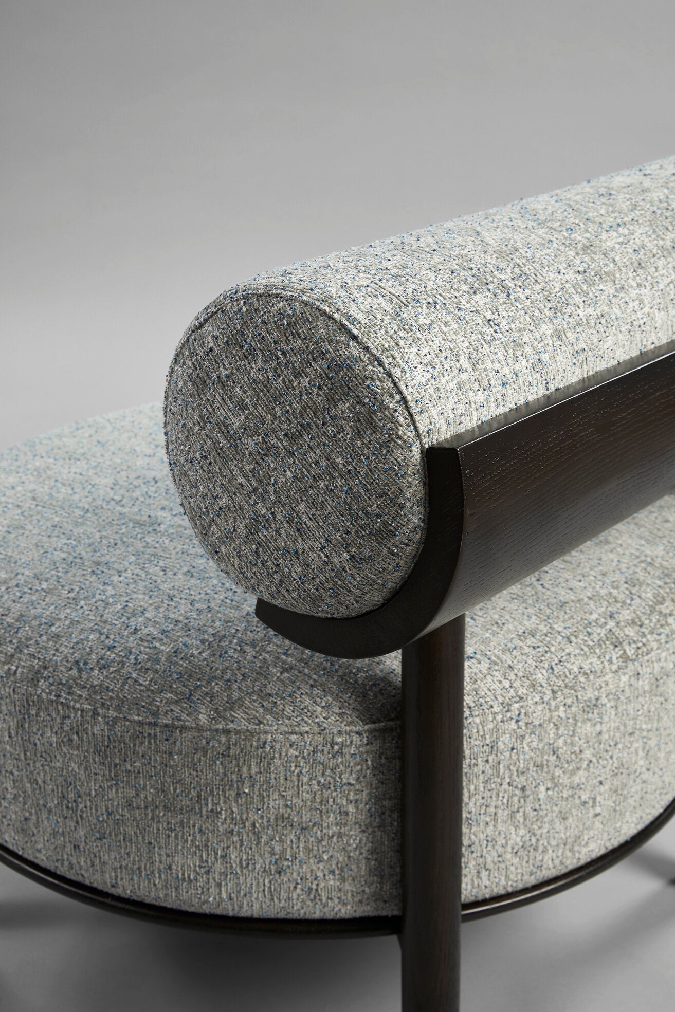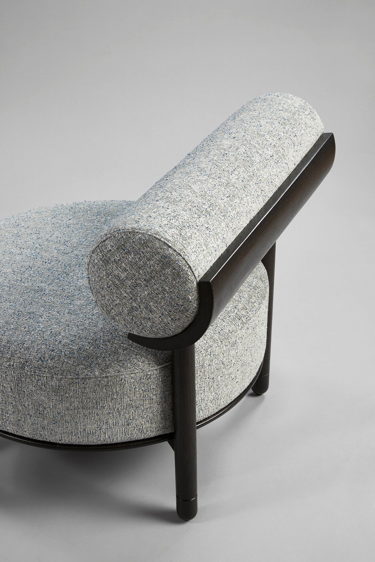 In japan, the torii are the portals that lead the way to the entrance to shinto temples, marking the border between the sacred world and the profane world. the result of ancestral craftmanship, they are built according to complex assemblies. outside of their religious context, these architectural elements, real sculptures erected towards the sky are compared to land art. inspired by these traditional constructions, the torii chair is a composition based on the motif of the cylinder: the first, whole, constitutes the crosspiece of the backrest; the second, hollowed out, is used as a resting place and the third, in the form of a cross-section, is intended for the seat. the whole is dressed in a fabric splashed with blue, and set on a base in anthracite oak.