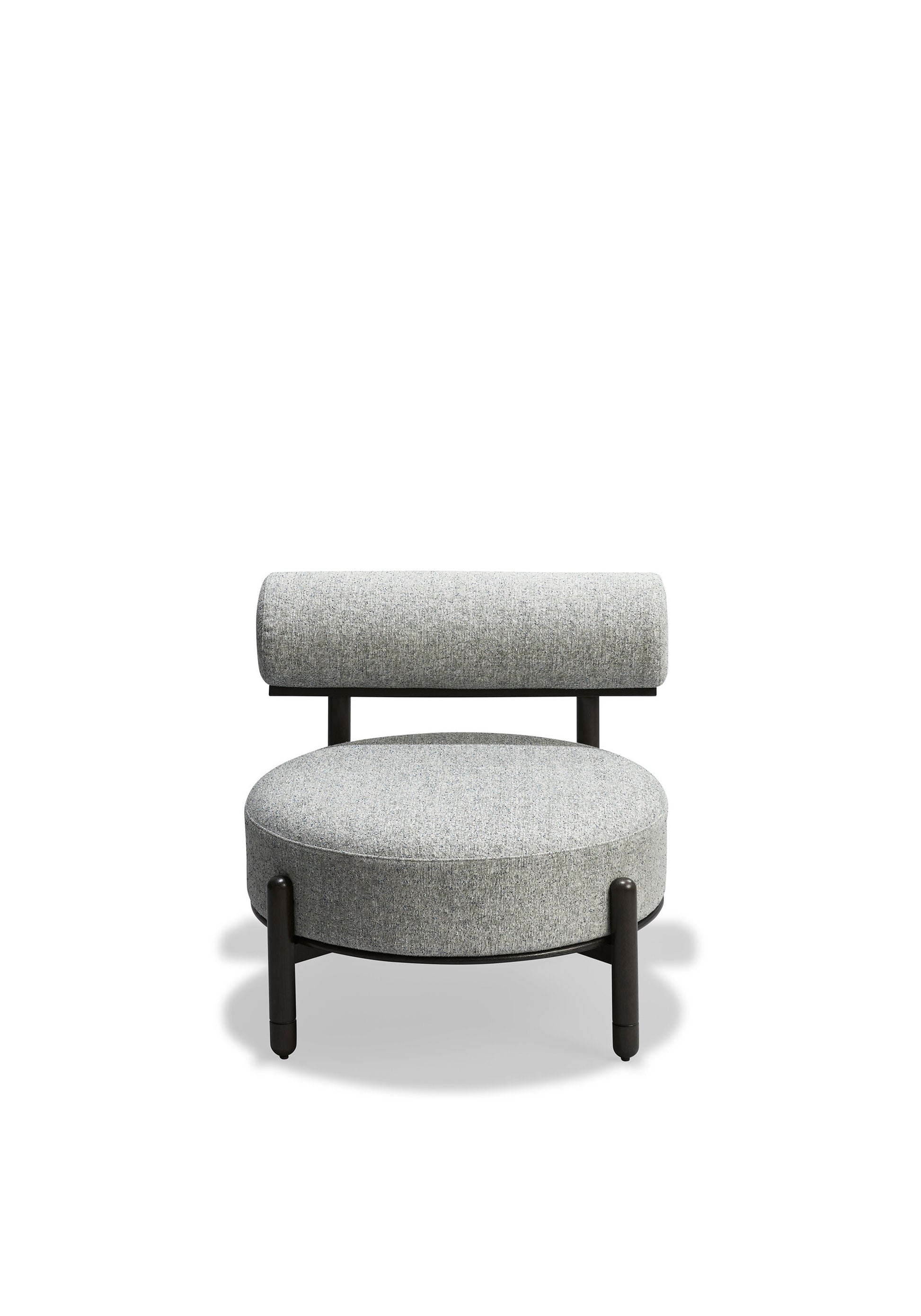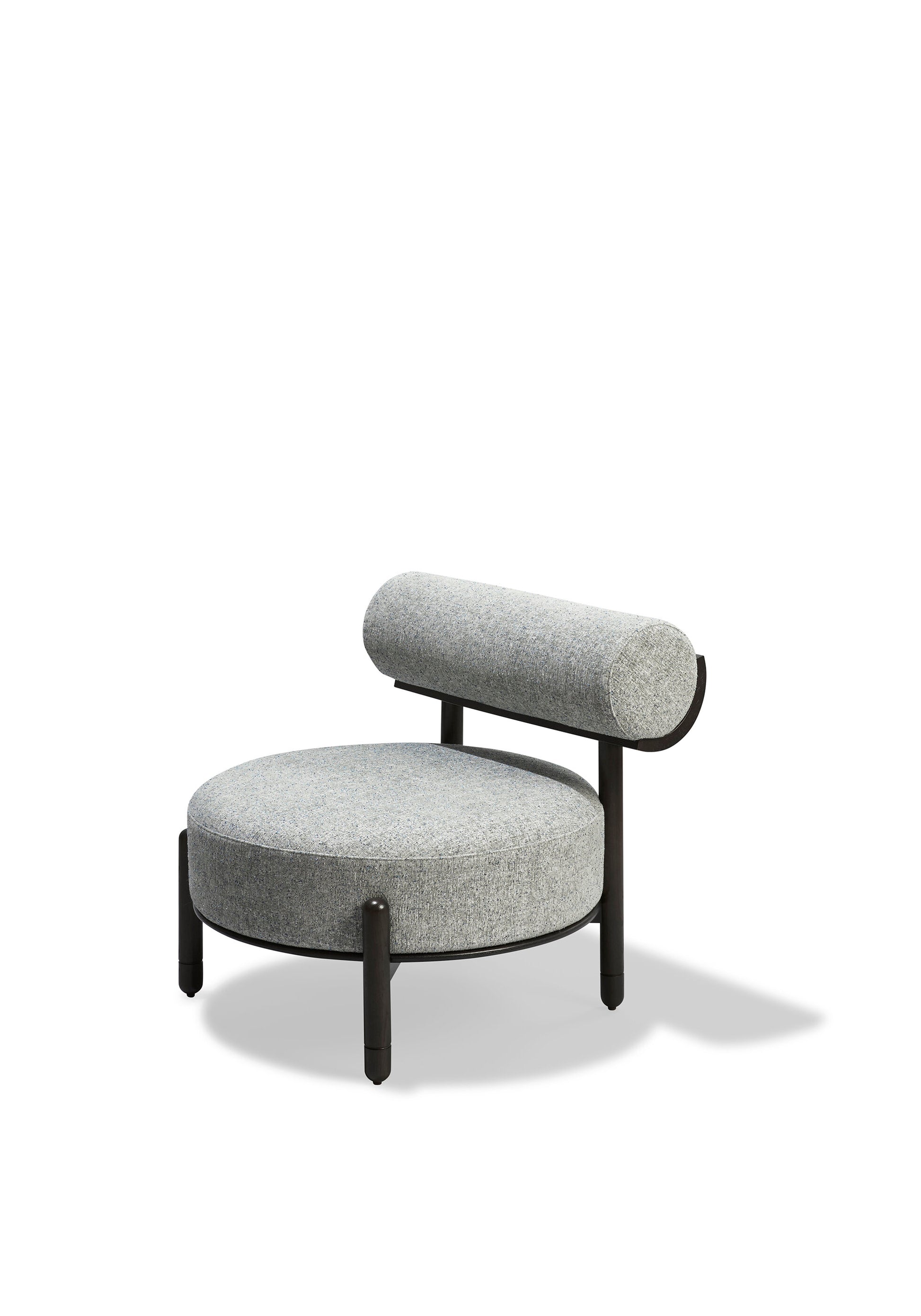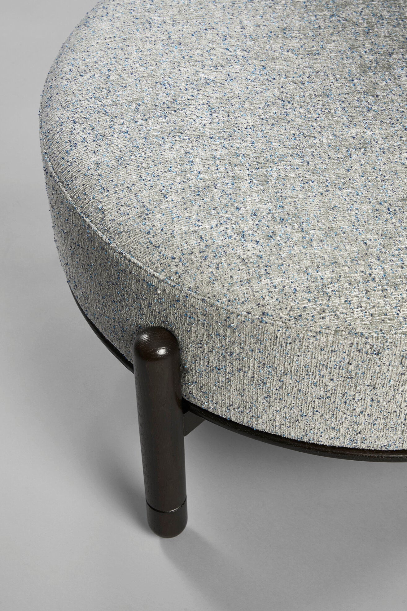 In japan, the torii are the portals that lead the way to the entrance to shinto temples, marking the border between the sacred world and the profane world. the result of ancestral craftmanship, they are built according to complex assemblies. outside of their religious context, these architectural elements, real sculptures erected towards the sky are compared to land art. inspired by these traditional constructions, the torii chair is a composition based on the motif of the cylinder: the first, whole, constitutes the crosspiece of the backrest; the second, hollowed out, is used as a resting place and the third, in the form of a cross-section, is intended for the seat. the whole is dressed in a fabric splashed with blue, and set on a base in anthracite oak.