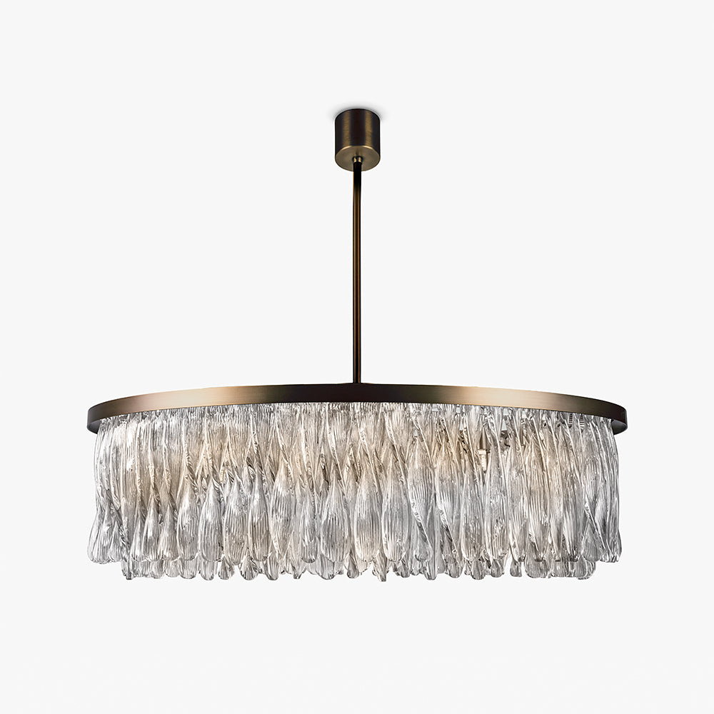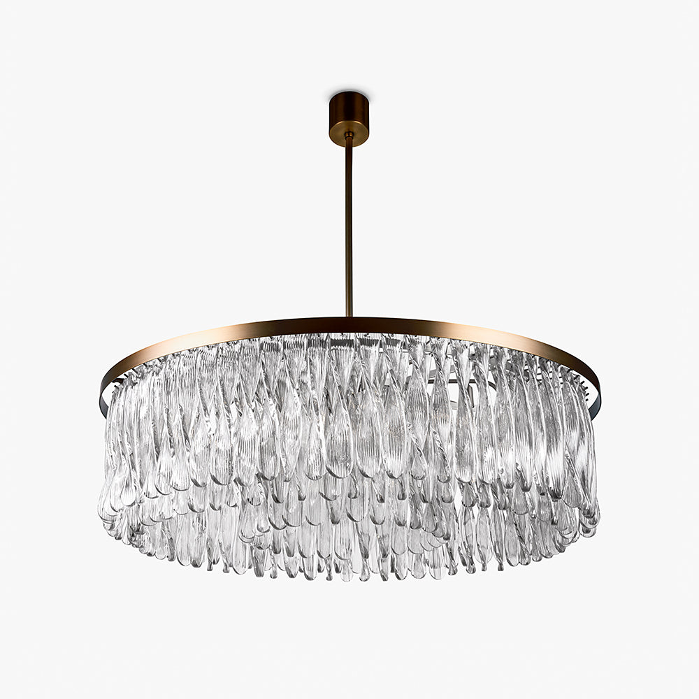 The ornate and striking glass ribbons that adorn the sleek band of this inspiring piece create the illusion of cascading water, adding grandeur and character to any room. A design that incorporates this chandelier is instantly transformed into a spacious masterpiece. Available now in a spectacular triple drum version in three brushed metal finishesFinish note: Due to the nature of our hand made product our finishes can vary from piece to piece. Please be aware studio lighting can affect tone of metals and alter material appearance slightly. For more details, speak to your sales advisor who may be able to organise sampling upon request.