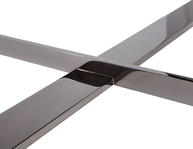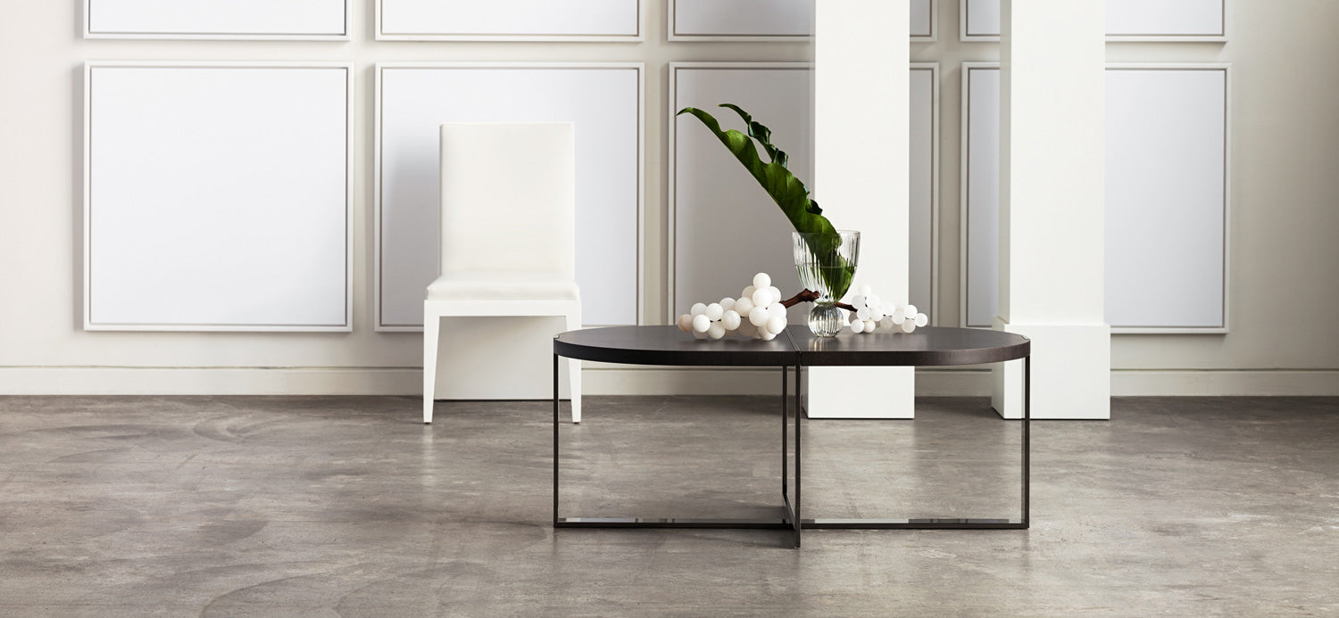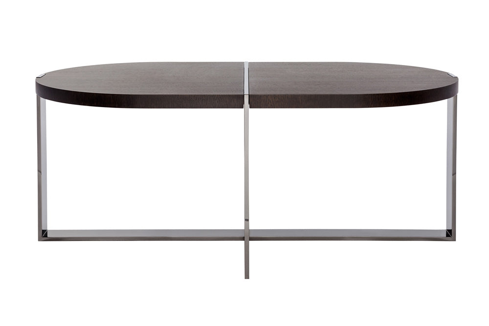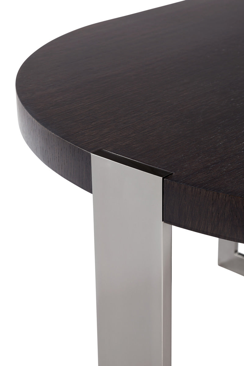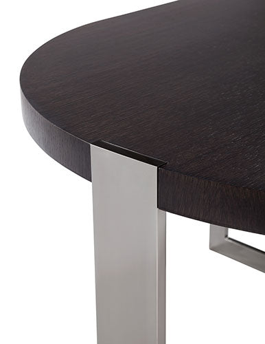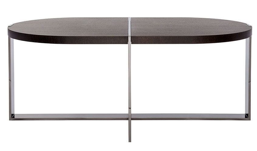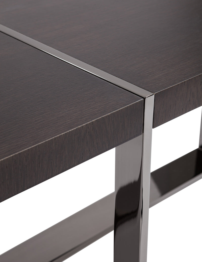 depending upon from which angle it is viewed the “trocadero” table reveals a decidedly different persona. its metal frame solidly grips the top while at the same time bisecting it.