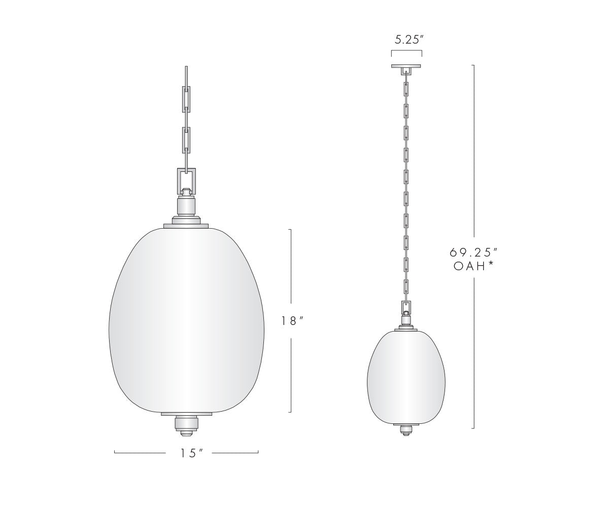 The Trumilly Amphora Pendant is machined by hand from solid brass. All parts are hand polished and patina’d. The frosted Amphora blown glass is secured by machined brass parts.