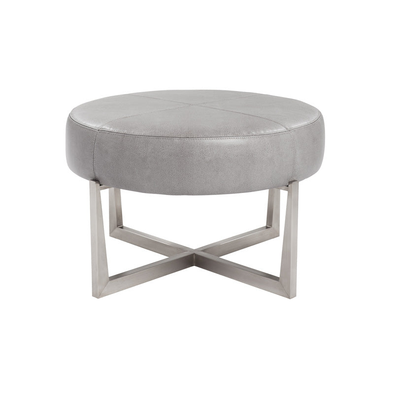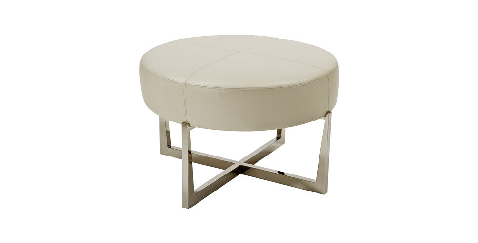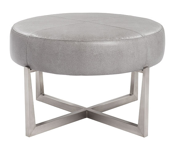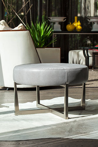 round leather ottoman with top-stitch detailing and reverse tapered iron base.