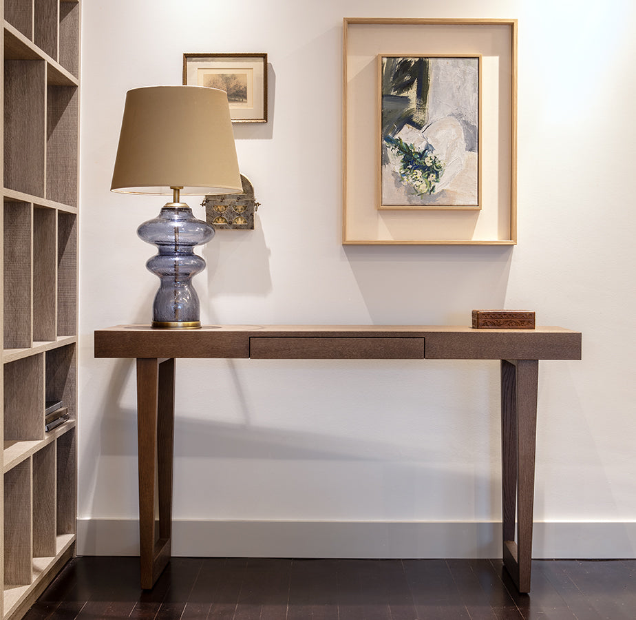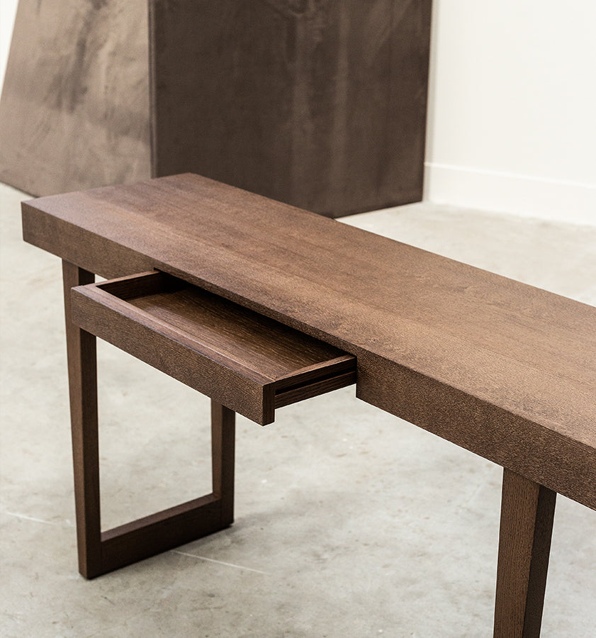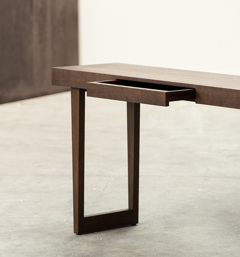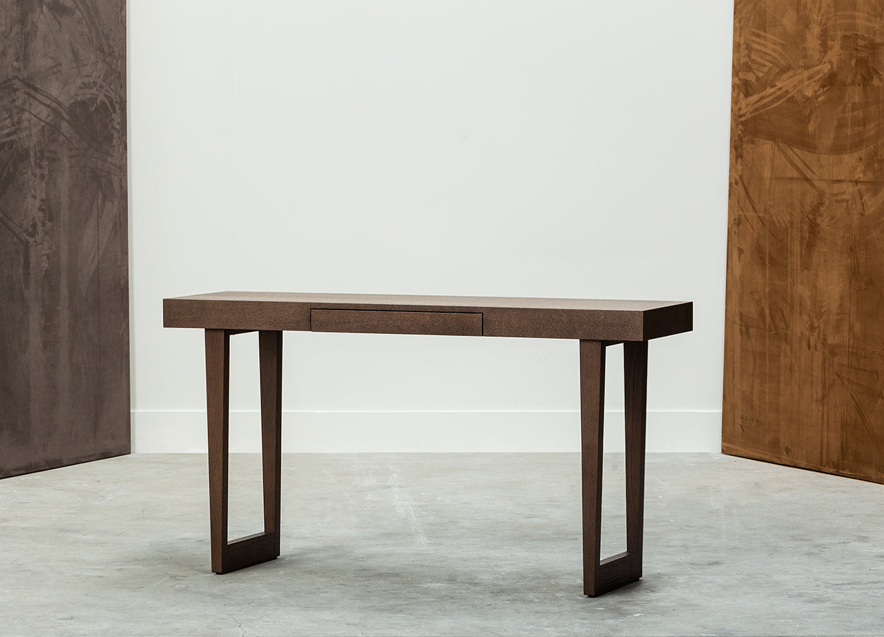 This desk features an oak veneer top and solid wood legs. It is available in oak with standard finishes. Optional drawers are also available. Alternate sizes or finishes available on request.