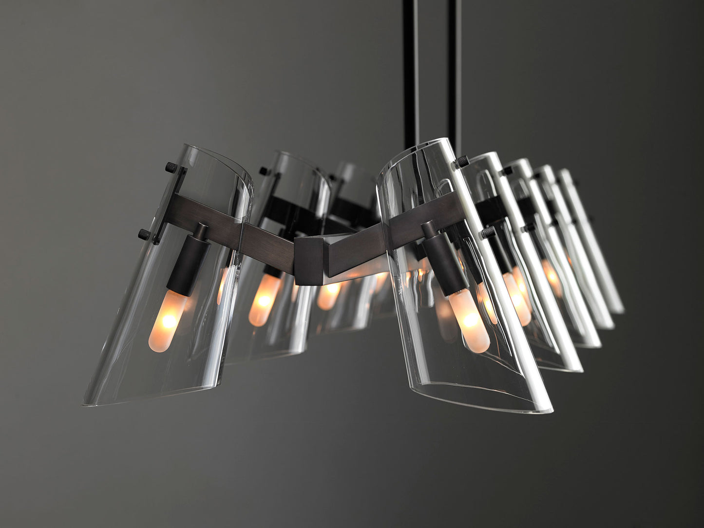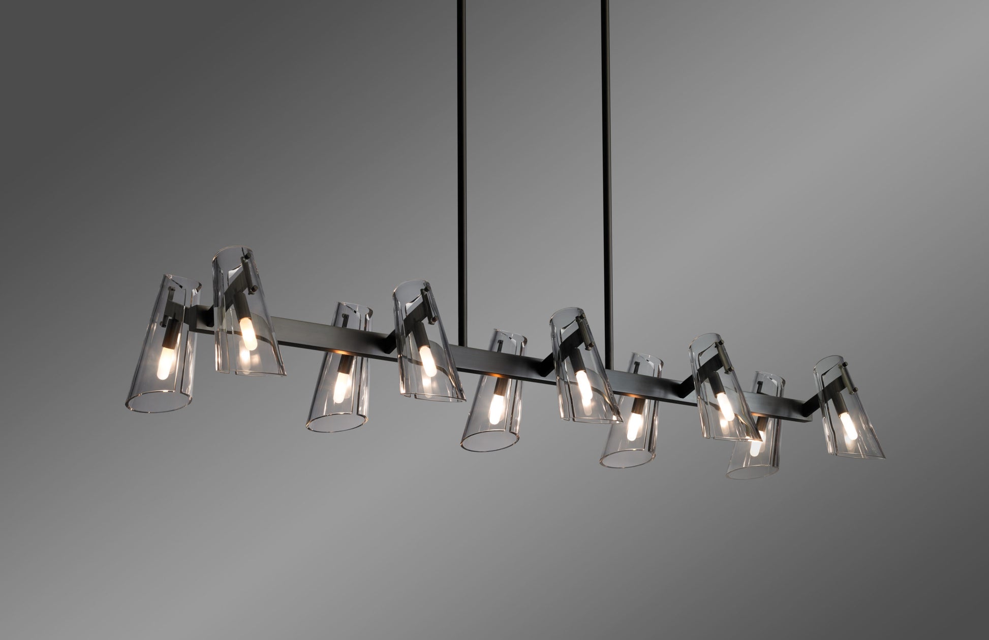 The Valette Linear Chandelier is machined by hand from solid brass. The shade is hand-blown and precision-cut to acquire the unique shape. All parts are hand polished and patina’d.