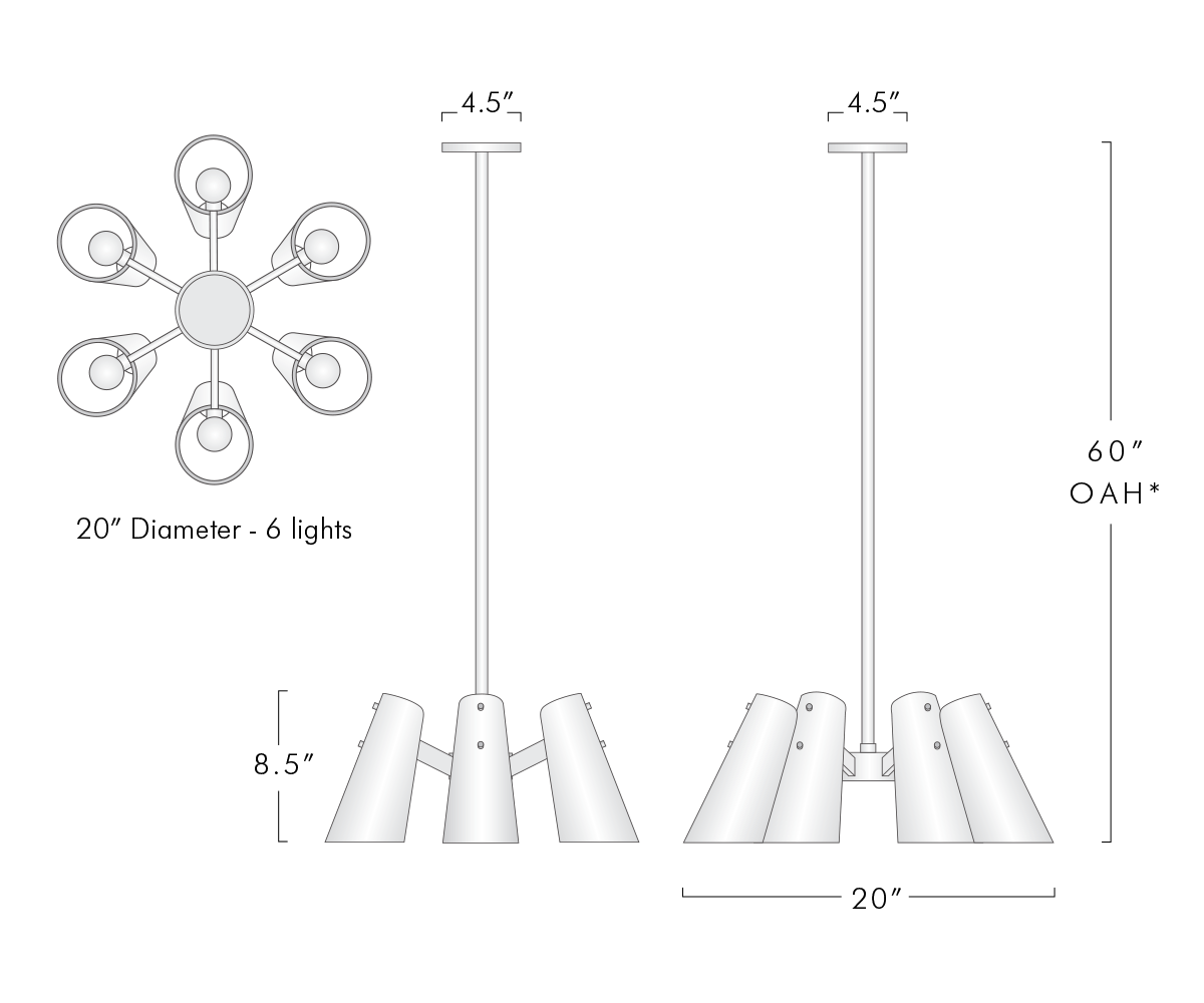 NET WT: 22 lbs CEILING PLATE / J-BOX: 4.5” Diameter / J-Box on center ELECTRICAL: 6 x E12 4W LED bulb MODEL #2221