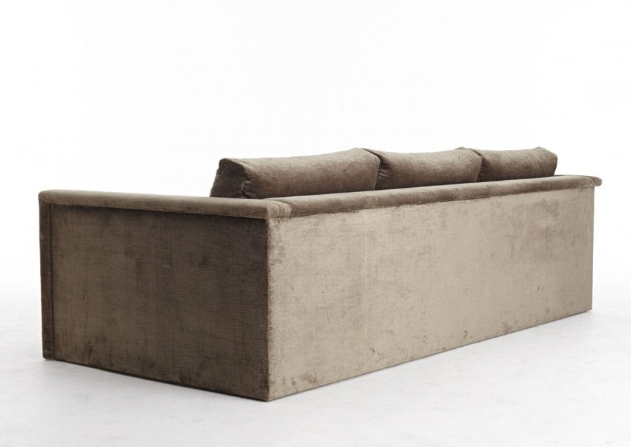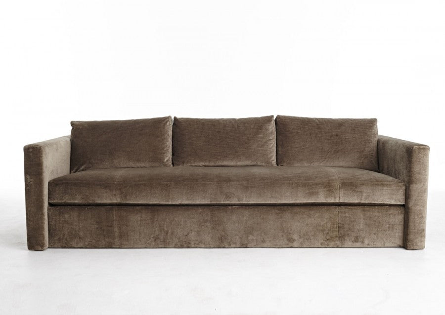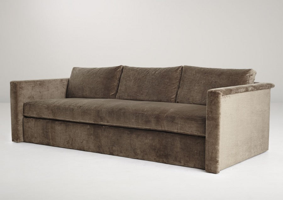 Single loose seat cushion, boxed and double topstitched. Loose back cushions, boxed and double topstitched, 50/50 down and feather fill. Upholstered base to floor.